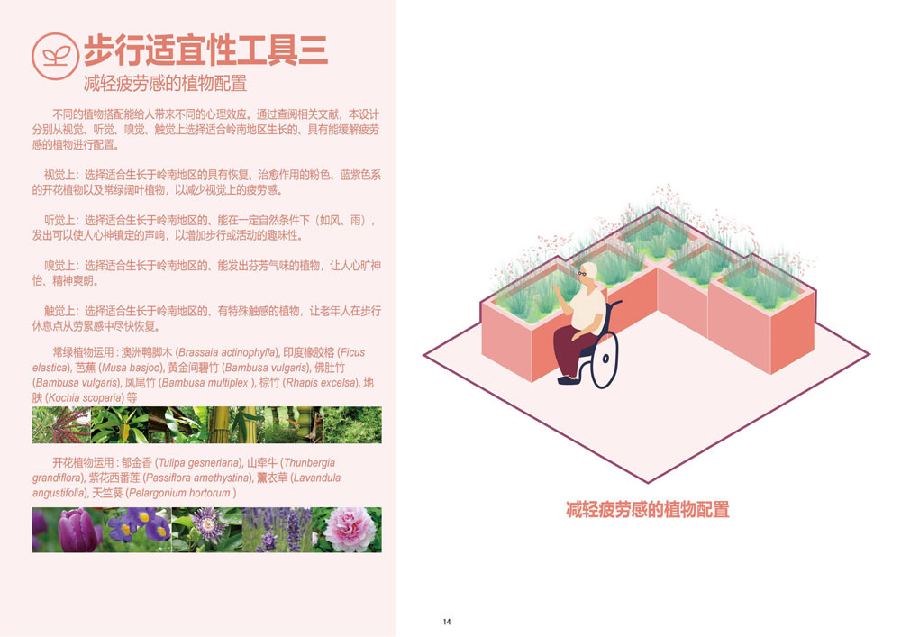 Guangzhou is facing the challenges of population aging while facilities are lack of care for the elderly, among which Yuexiu district is the most serious. It is urgent for the local government and landscape architects to consider how to upgrade the existing outdoor environment for healthy aging. A growing number of researches have shown that mood, built environments and walkability are closely associate with the mental and physical health of the elderly. The project responded to these problems through the perspective of mood effect, taking Yuexiu district for basic research. Based on the local conditions and the mental health needs of the elderly, the project proposed 4 types of strategies through field surveys and analysis, including 1) planning pedestrian routes, 2) using colors that can reduce fatigue, 3) planting plants that can reduce fatigue, 4) setting Age-friendly paving. The project also selects a typical neighborhood as a design sample. Tt provides practical ideas for more communities to cope with the population health problems brought by the aging trend, having positive social, academic and practical values.